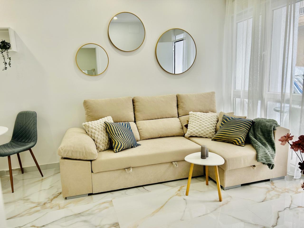 disponen de un amplio salón con cocina integrada con muebles y electrodomésticos todo a estrenar , un amplio y elegante baño, un amplio dormitorio con armario empotrado de 3 metros y canapé en cama de 1,50, y un balconcito en la puerta para poder sentarse en el exterior ....todo escogido con exquisito gusto,